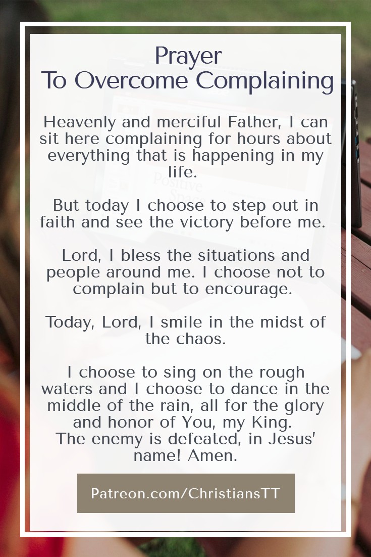 Heavenly and merciful Father, I can sit here complaining for hours about everything that is happening in my life. But today I choose to step out in faith and see the victory before me. Lord, I bless the situations and people around me. I choose not to complain but to encourage.
